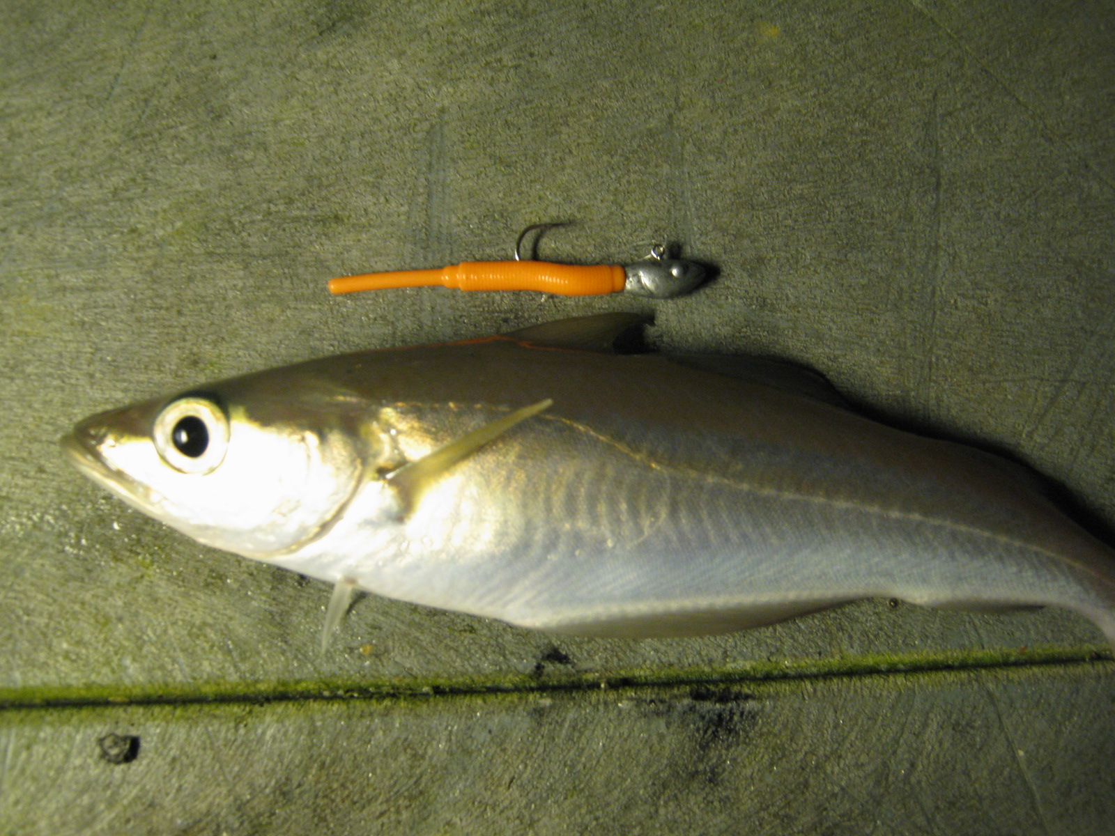 It was apparent on the first cast that we were a little early, as this venue relies on the tidal flow to bring bites from the resident fish population, and it was about half an hour or so before the jigheads began to be pushed along and we were able to present the strawtails effectively in the flow. As if by magic the fish began to appear, as some tiny Pollock hit the plastics. Sport was a little sporadic and I was definitely a little rusty, but It began to come back to me and I nailed a couple of slightly better fish, on an orange coloured strawtail, the best going about 12 oz's, which put up a good fight on my Graphite leader Calzante lrf rod !